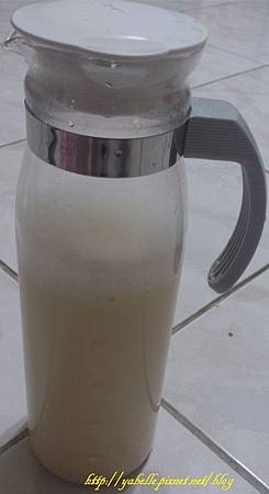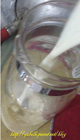 把過濾好的豆漿倒入先前已放糖的玻璃水壺中 這樣可以同時加糖 也不需要再花時間攪拌 省時又方便